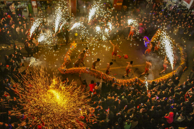 甘棠耍火龙是产生并流传于开江县甘棠镇的一种祈求免灾避祸,来年风调雨顺、五谷丰登的民间文化活动,始于清乾隆年间,距今已有两百多年历史。“火龙”一般是由竹条、鳞布、绳索等材料制作成仿龙形状的表演道具,制成的“火龙”包括龙宝、龙头、龙身、龙尾四部分共计九节。火龙队伍主要由执掌宫灯、排灯、灯幡、灯牌、火龙灯等环节的40余人组成,共同进行请龙参神、祭龙请饮、赐福烧花、送龙归海系列表演。