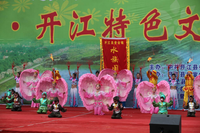 水族闹春产生并流传于四川省开江县的普安镇,是老百姓扮演水族精灵以祈福风调雨顺、五谷丰登、生活安康的一种传统民间舞蹈。水族闹春通过舞蹈动作、服饰装扮赋予蚌、鱼、龟、虾、鳖等水族精灵人物性格,巧妙地将水族精灵的欢悦起舞同老百姓祈福风调雨顺的愿望结合起来,独具一格。同时因为水族闹春独特的表现手法和不受表演空间限制的特点,使其活动场地较为自由,街头、田间、院坝都可以成为水族闹春的表演场地。