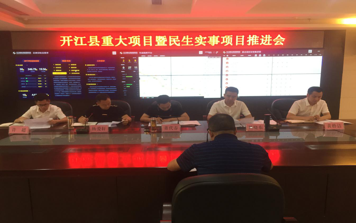 6月27日下午,县委常委、常务副县长董代春同志在县重大项目作战指挥室主持召开了开江县重大项目暨民生实事项目推进会,杨晓东、杨爱轩、黄橹洁、许超等指挥长出席了会议,各乡镇主要负责人和相关部门负责同志参加了会议。会议听取了县发改局对2019年1至6月全县30个重大项目及11件民生实事项目推进情况、固定资产投资入库完成情况和2018—2019年中央预算内投资项目建设进展情况的汇报。