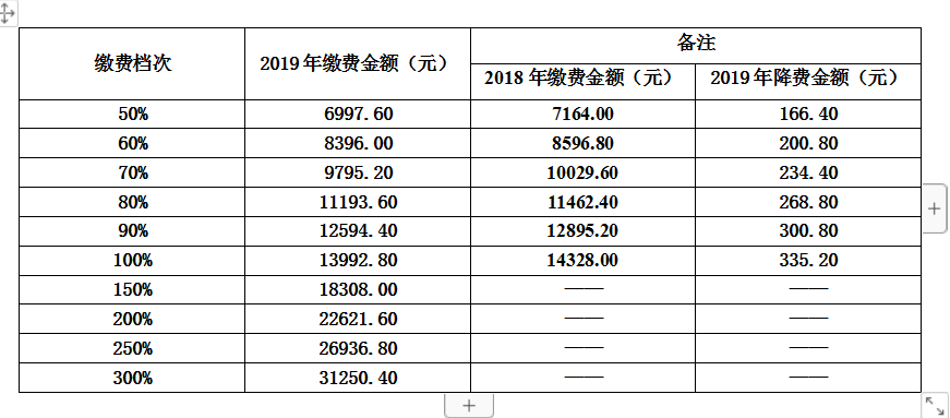 三、缴费标准:缴费基数2019年1月至4月为四川省2018年城镇非私营单位在岗职工平均工资80464元,2019年5月至12月为四川省2018年全部城镇单位就业人员职工平均工资64717元。请个体参保人员在50%--300%之间自行确定缴费档次,分档缴费标准如下: