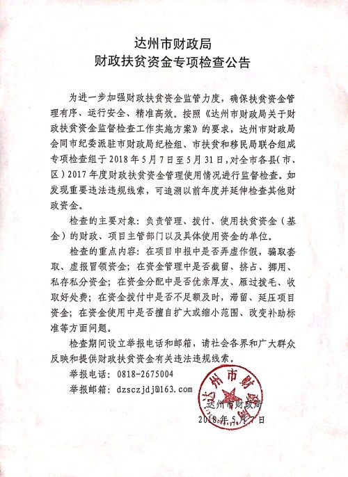 达州市财政局财政扶贫资金专项检查公告