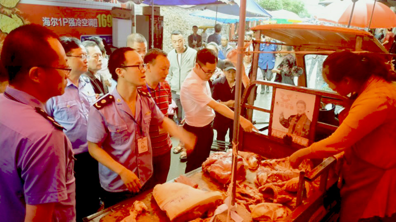 为切实保障全县生猪产品质量安全,消除猪肉及肉制品消费安全隐患,严防非洲猪瘟疫情传入,保障人民群众食品安全,2019年6月15日凌晨3时许,副县长许超带领县市监局党委书记、局长张林等30余名执法人员以及县农业农村局、县畜牧发展服务中心等工作人员,冒雨对开江县后厢片区的猪肉市场进行了突击检查,此次行动共查处了8家非法经营者,销毁未经检验检疫的猪肉1000余斤。
