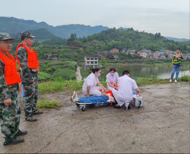 模拟背景一为受暴雨影响,龙家坝村舒家沟水库内群众被洪水围困家中,需立即进行救援。演练开始,险情发生后,接到情况报告,镇党委、政府立即启动对应应急预案,部署救援力量、调动物资赶赴现场。全力解救被洪水围困的群众,救援队伍利用冲锋舟将被困群众转移到安全位置并进行医疗救护。