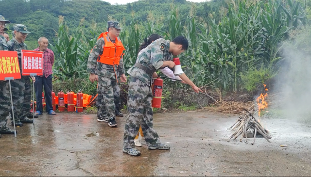 模拟背景二为龙家坝村森林发现火情,需立即前往进行处置和扑灭。应急抢险救援指挥部接到火情报告,立即安排森林防灭火救援分队进行处置,森林防灭火救援分队快速响应,人员、装备、物资有序进入灾情点位,使用工具开出火灾隔离带,再用灭火弹、灭火工具以及灭火器等扑灭火源,快速有效扑灭森林火灾。同时对各项救援器材进行了逐一演示和使用讲解。