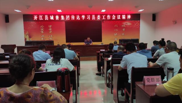 7月27日,开江县城普集团召开专题工作会议,传达学习县委工作会议精神,安排部署贯彻落实措施,集团公司党委书记、董事长伍明波主持并讲话,城普公司、建设公司、房开公司、中源宝鑫公司全体干部职工参加会议。