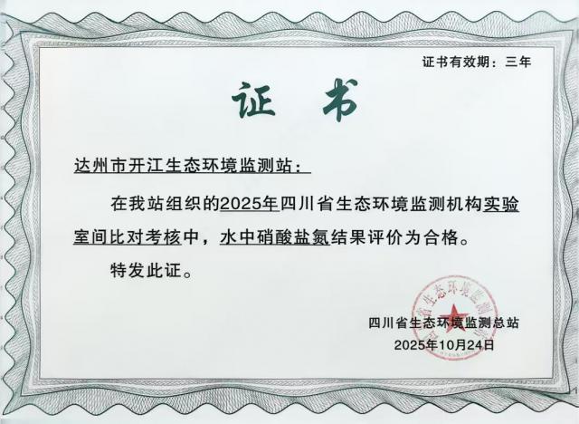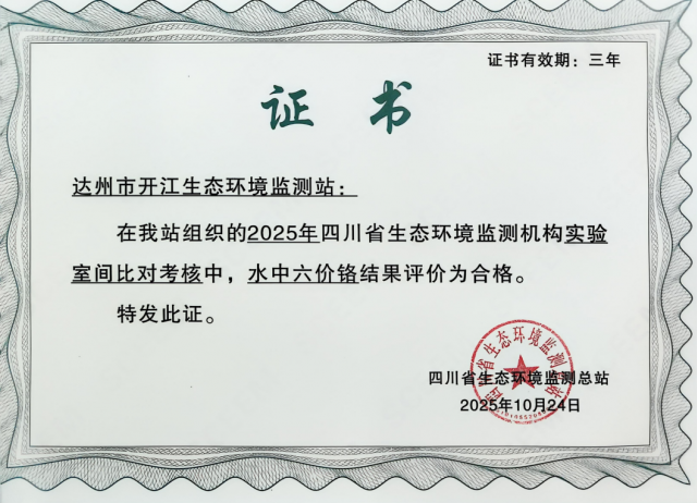 近日,达州市开江生态环境监测站顺利通过2025年四川省生态环境监测实验室间比对监测,四川省生态环境监测实验室间比对是生态环境监测质量管理工作的有效方式之一,比对监测工作的顺利通过,是对开江生态环境监测站质量管理工作以及监测能力的充分肯定。