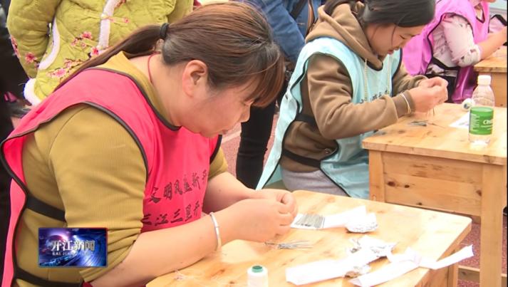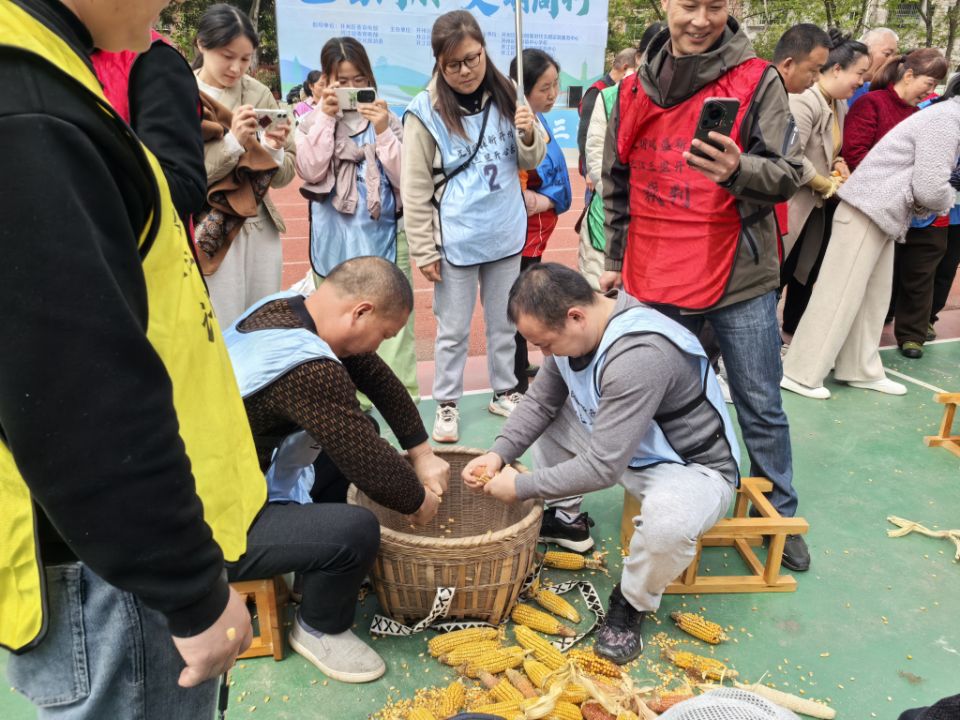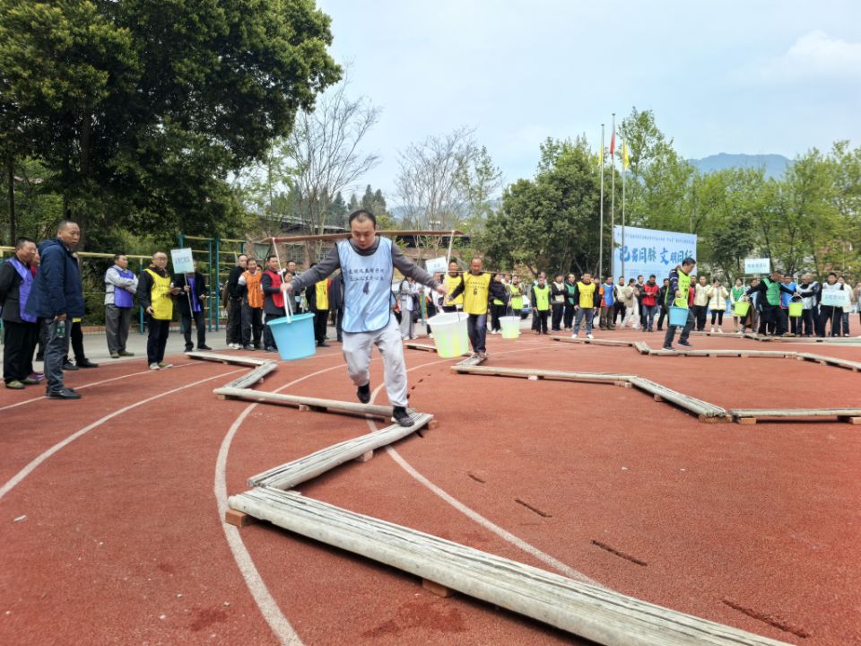 运动会现场,8项与农事生产生活息息相关的比赛正精彩上演。粮食运输赛中,选手们背着背篓,一边奔跑一边装南瓜,动作敏捷;过独木桥比赛,他们担着水桶小心翼翼地穿过独木桥,平衡能力令人惊叹;穿针引线考验着选手们的耐心和细致;挑粮接力赛、玉米手工脱粒赛、模拟插秧赛等项目则将农耕劳作与体育竞技完美结合,让观众仿佛置身于丰收的田野之中。袋鼠跳接力和拔河比赛更是将现场气氛推向高潮,加油声、欢呼声此起彼伏。
