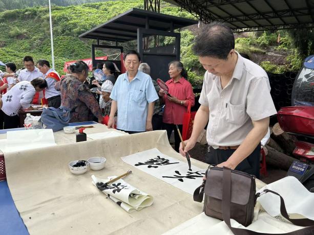 活动还组织了现场参观体验环节。与会嘉宾先后前往藤茶基地和加工厂,现场参观党员示范种植区、体验采摘乐趣、了解藤茶制作工序,亲身感受梅家乡在党组织带领下藤茶产业的蓬勃发展态势。县作协书法家现场挥毫泼墨,书写“党建领航促振兴”等作品,为活动增添浓厚的党建文化韵味。