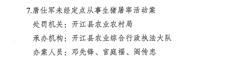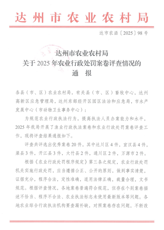本次获评的3件优秀案卷均聚焦农业领域突出问题,涵盖渔业资源保护、农资质量监管、生猪屠宰监管等重点执法领域,不仅展现了开江县农业执法部门在打击涉农违法行为、保护农民合法权益、维护农业市场秩序方面的坚定决心和高效行动,也体现了执法人员扎实的法律功底、严谨的工作态度和出色的办案能力。