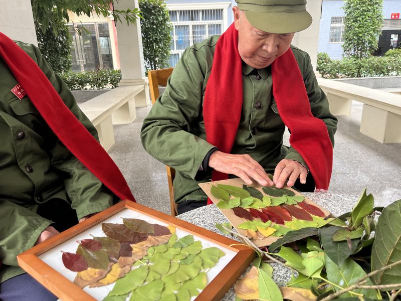 光荣院内欢声笑语不断。工作人员别出心裁地引导老人们利用随处可见的落叶进行艺术创作。形态各异、色彩斑斓的树叶,在老人们灵巧的手中,经过挑选、修剪、拼接和粘贴,被精心装点进一个个素雅的相框里。这些原本平凡无奇的落叶,瞬间被赋予了新的生命,化作一幅幅独具匠心的秋日画卷,将转瞬即逝的秋日美景永恒定格。