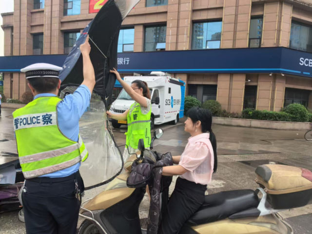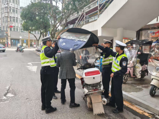 执勤人员在城区主要路段设置临时检查点,采取“整治教育”的方式,对非法加装遮阳伞的电动二(三)轮车和摩托车进行了现场拆除,恢复车辆原状,对驾乘人员进行了普法宣传和警示教育,告知其加装遮阳伞的危害性。