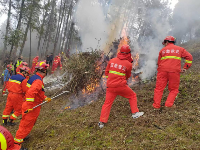 在现场指挥部统一部署及县指挥部办公室人员现场指导下,各参演小组分工明确、协同高效。现场指导组全程统筹调度,精准把控演练节奏与处置方向;应急灭火组携带专业灭火装备向火点发起攻坚,川渝两地队员紧密配合、协同作战,形成强大扑救合力;秩序维护组迅速布设警戒线,有序疏散周边群众,全力维护现场秩序;后勤保障组高效完成物资补给与通讯保障,为救援行动顺畅推进提供坚实支撑;医疗保障组全程待命,随时准备开展受伤人员紧急救治。经系列紧张有序处置,“火情”得到有效管控,明火成功扑灭,队员们随后细致清理余火、严守火场,严防复燃风险,圆满完成全部预设演练科目。