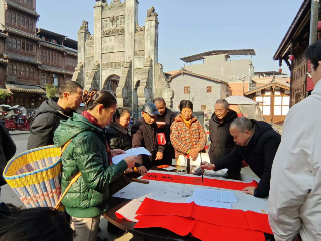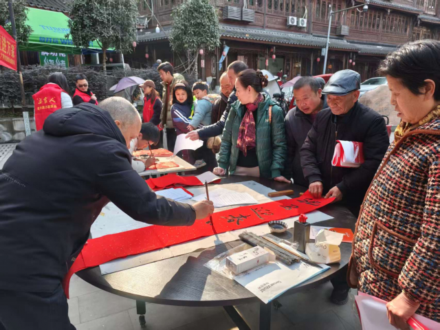 活动现场喜乐融融、暖意涌动,氛围感直接拉满。作为新时代文明实践的重要载体,此次活动将非遗传承与文明送福相结合,国家级非物质文化遗产梁平木版年画陈列有序,红彤彤的春联纸整齐摆放,书法家们挥毫泼墨,一幅幅寓意吉祥的春联跃然纸上,一张张色彩鲜亮的年画传递着浓浓的年味。本次新春送祝福活动共送出梁平木版年画300余幅,手写春联 200余副,惠及群众 400 余人次。活动不仅营造了“家家户户贴春联、欢欢喜喜迎新春”的节日氛围,更彰显了 “文化惠民、文化乐民”的服务理念,让群众在参与中感受传统文化的魅力,在互动中体验节日的欢乐。